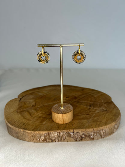 Les boucles faites en pierres naturelles Jaspe Dalmatien donut sont un incontournable de la boutique avec sa petite breloque connecteur en acier inoxydable inscription "love"