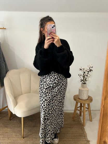 Jupe satin, élastique à la taille imprimé léopard, coupe sirène.